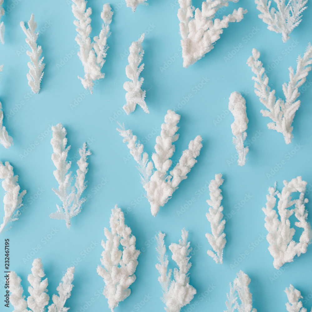 Composition of snowy Christmas tree branches on pastel blue background. Flat lay.