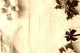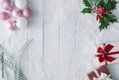 Snowy Christmas background composition with decoration and New Years gift boxes. Flat lay. Top view.