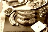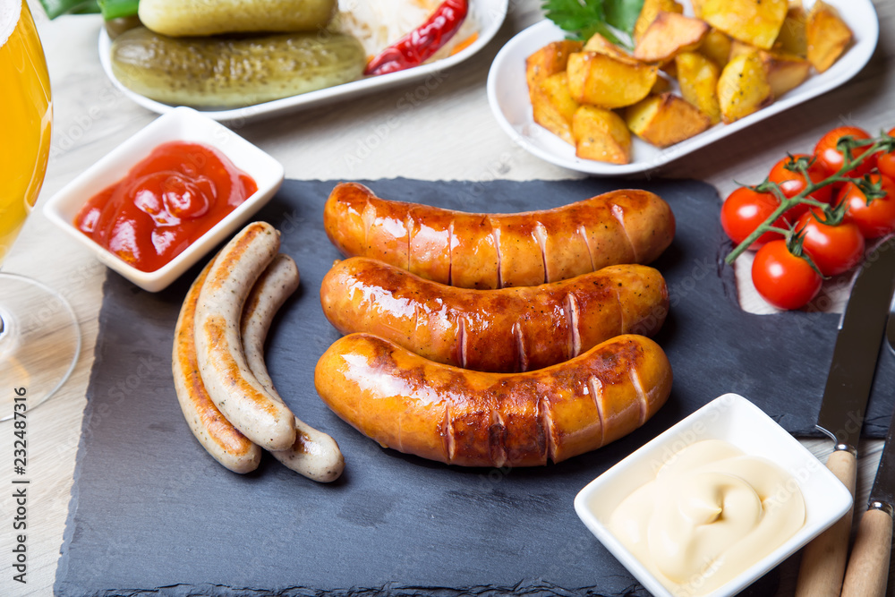 Grilled sausages with potatoes, cucumbers and sauerkraut, with two sauces. Close-up, selective focus.