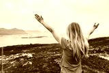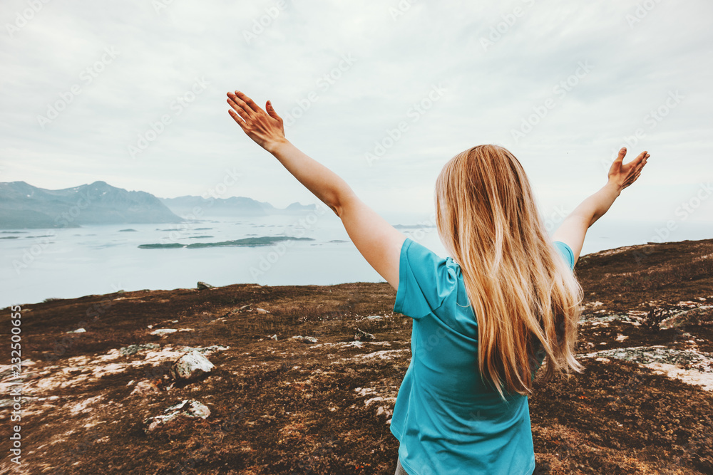 Woman raised hands enjoying landscape traveling in mountains healthy lifestyle adventure vacations outdoor success positive emotions blonde girl