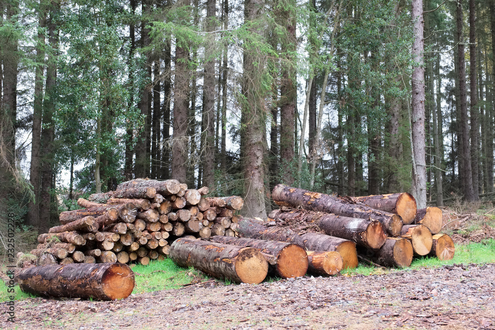 Chopped wood logs for sale use in fire place at home stored on forest woods green biomass energy uk