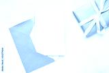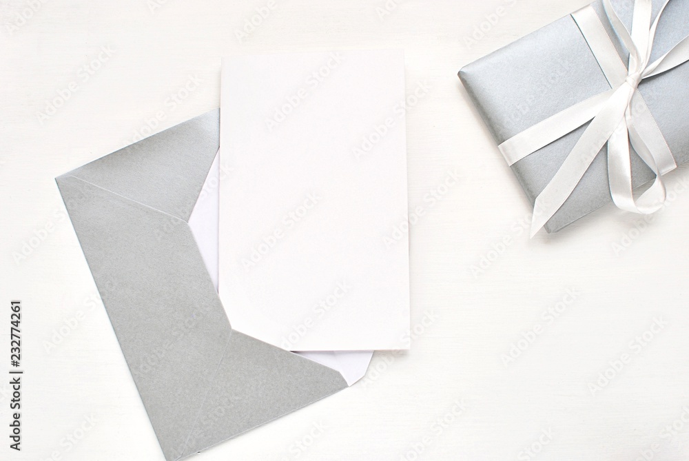 Christmas, New Years, wedding greeting card, invitation mock up, blank card and silver envelope, flat lay on white background.