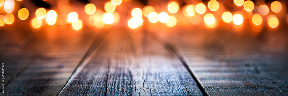 Bokeh Of Christmas Lights On Vintage Wooden Plank Table