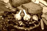 Food. Garlic for colds. Rye sliced baked homemade fresh bread with garlic, red hot chili peppers and spices on a rustic wooden kitchen table.