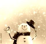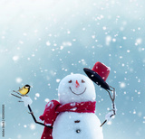 Merry christmas and happy new year greeting card with copy-space.Happy snowman standing in winter christmas landscape.Snow background