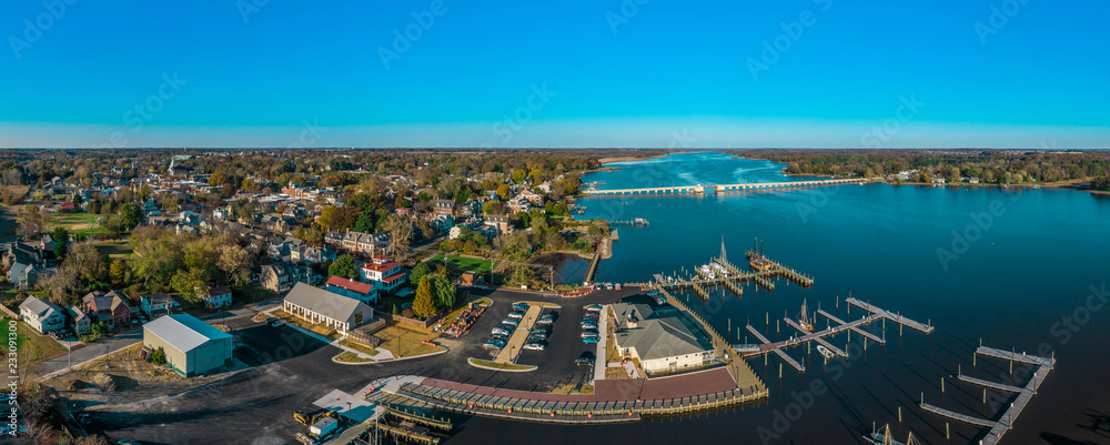 Aerial panorama view of historic colonial chestertown near annapolis situated on the chesapeake bay during an early november afternoon