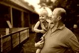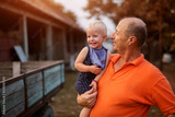 Picture of a proud grandfather holding his grandson and looking at him with love. Standing in a backyard of a farm.