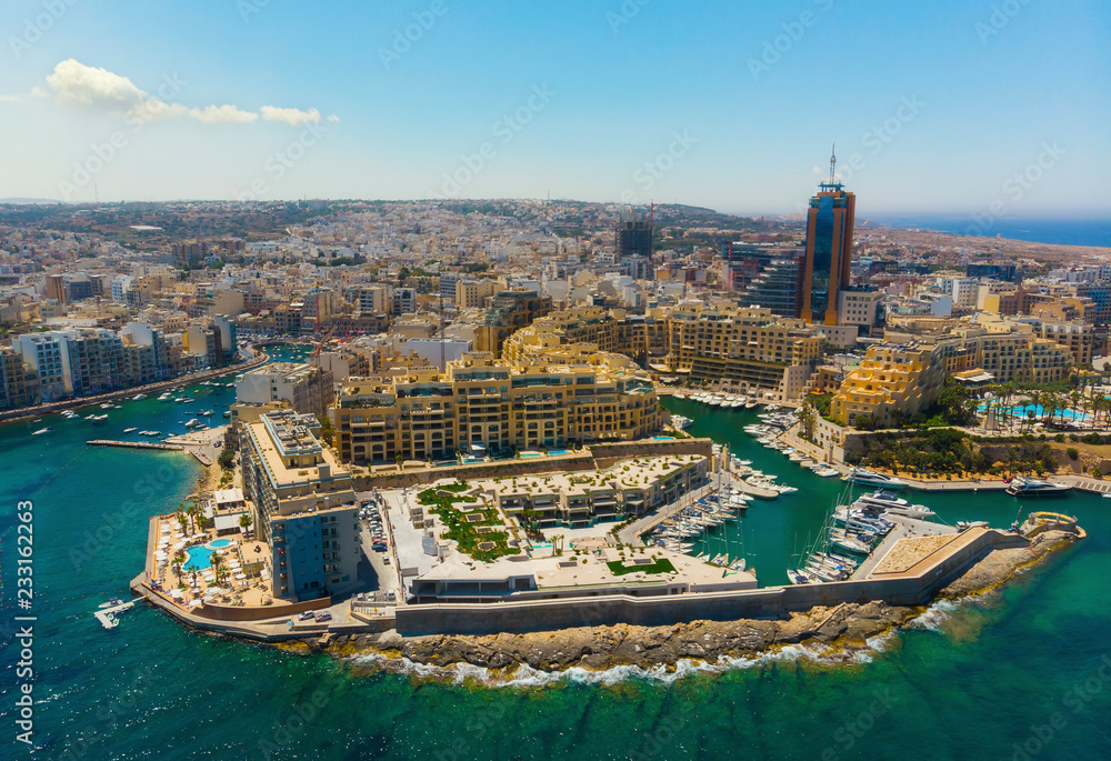 Arial view of St. Julian's city and Portomaso marina. Malta island. Sunny summer day.
