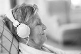 Sick senior woman with headphones lying in bed at home or in hospital.
