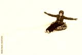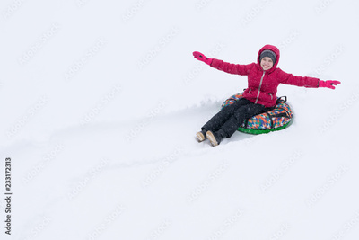 the girl rides on a round inflatable sled in the white snow, leaves traces