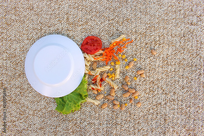Plate of food fell on carpet. Top view.