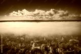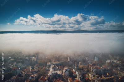 Varna, Bulgaria aerial drone view. Beautiful panorama of Varna city with morning mist.