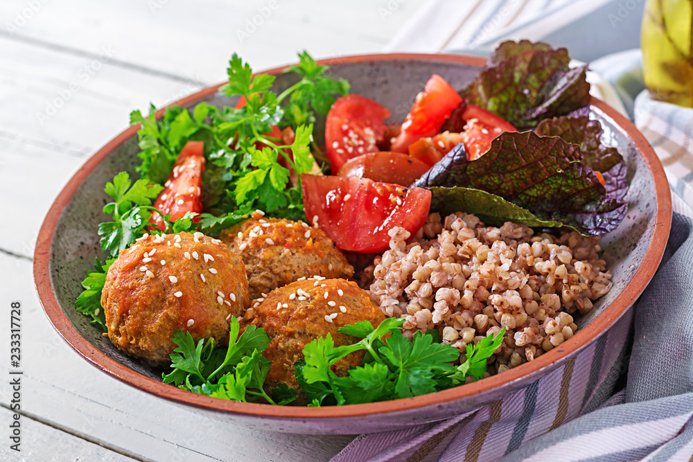Meatballs, salad of tomatoes and buckwheat porridge on white wooden table. Healthy food. Diet meal. Buddha bowl.