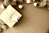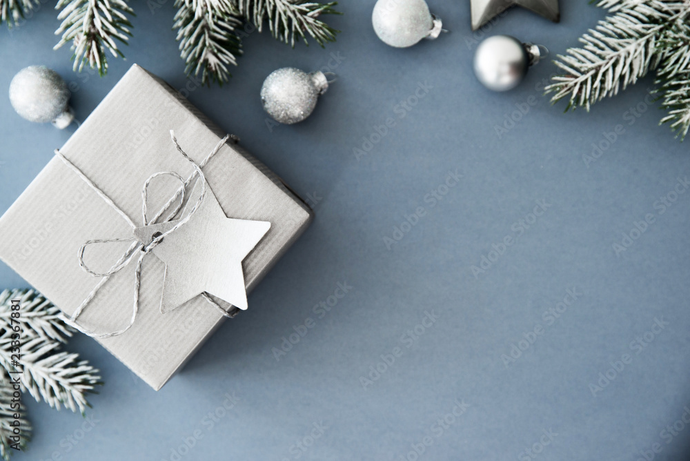 Christmas silver handmade gift boxes on blue background top view. Merry Christmas greeting card, frame. Winter xmas holiday theme. Happy New Year. Flat lay
