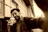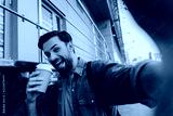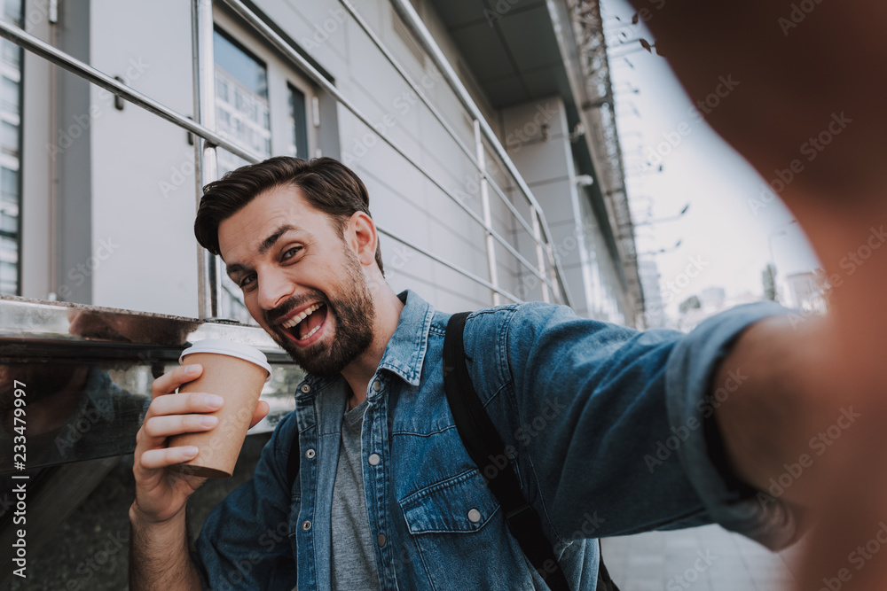 Portrait of optimistic bearded man having fun while doing selfie. He drinking cup of coffee outdoor