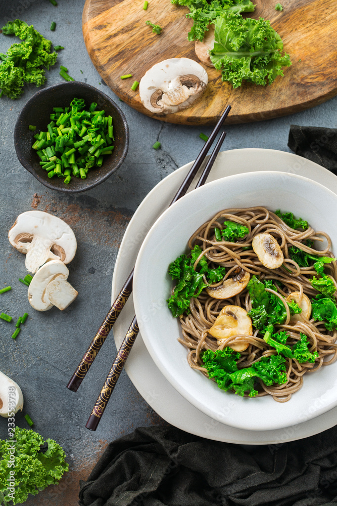 Buckwheat soba noodles soup ingredients for asian chinese japanese food