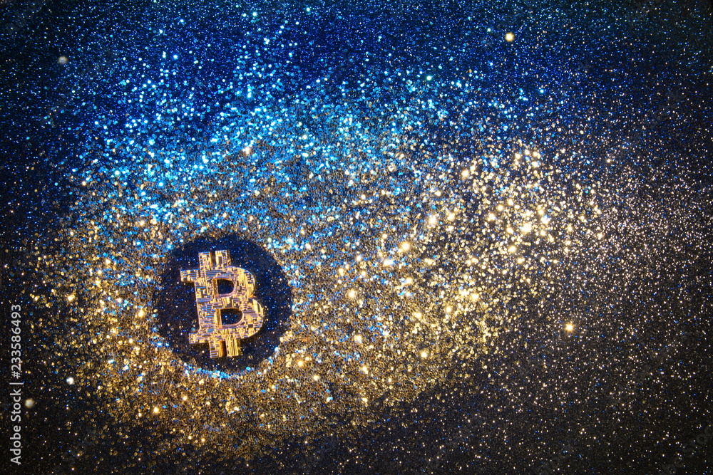 Golden bitcoin space universe, futuristic digital money, technology worldwide network concept.Crypto currency Gold BTC.Safe virtual money