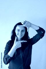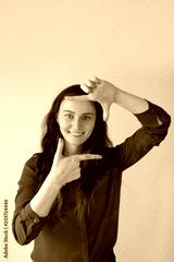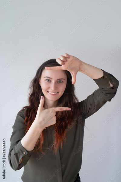 Cheerful pretty Caucasian girl showing photo sign and smiling. Young female photographer ready for work. Right perspective concept