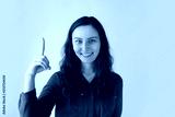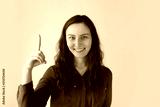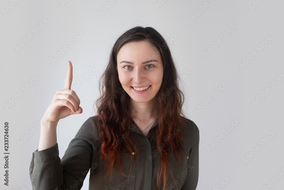 Happy pretty Caucasian girl raising one finger and smiling. Young specialist having brilliant thoughts. Creative teacher concept