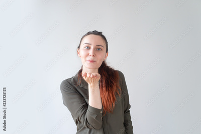 Portrait of positive pretty Caucasian girl blowing air kisses. Young female student sending love to boyfriend. Flirtation concept