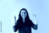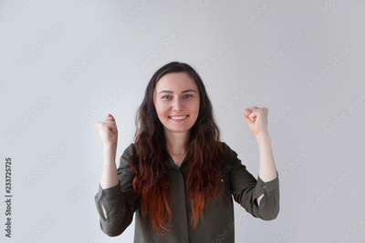 Positive pretty Caucasian girl clenching fists as symbol of victory. Young female spectator cheering favorite team. Fan support concept