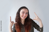 Positive pretty Caucasian girl making rock music gesture and smiling. Young female fan expressing love for favorite song. Concert concept
