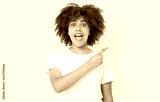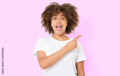 Young african american happy woman showing copyspace pointing on isolated pink background. Summer fun. Template, blank shirt. Afro curly hairstyle.