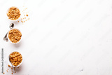 Granola Cereal bar on light Background . Muesli Breakfast. Healthy Food sweet dessert snack. Diet Nutrition Concept. Vegetarian food. Flat Lay. Copy space