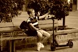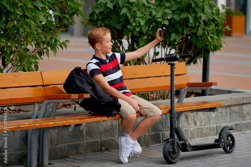 Happy smiling school boy with backpack and electric scooter outdoors. Childhood, leisure, school and people concept