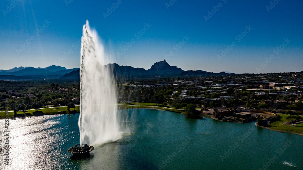 Aerial, drone view of the historic fountain at Fountain Hills Park in Arizona