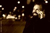 Hombre joven con barba y elegante en la calle, en una noche de invierno
