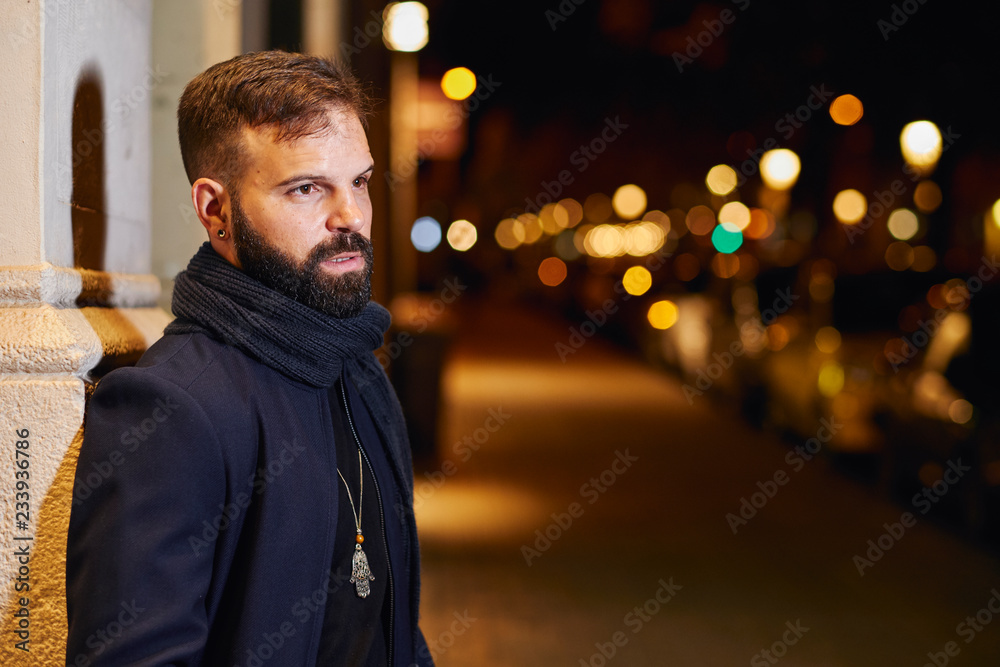 Hombre joven con barba y elegante en la calle, en una noche de invierno