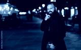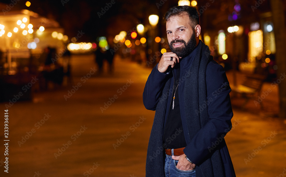 Hombre joven con barba y elegante en la calle, en una noche de invierno