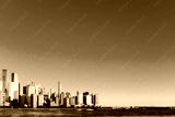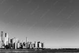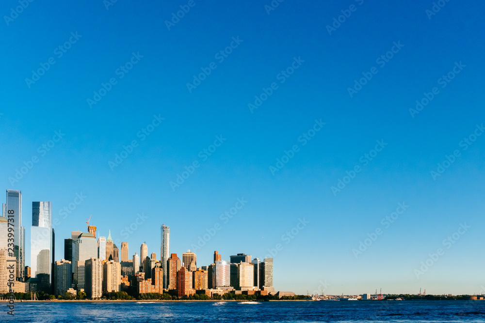 Skyline of downtown Manhattan over Hudson River under blue sky, at sunset, in New York City, USA