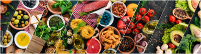 Collage. Background of vegetables, fruits and spices. Top view. On a wooden background.
