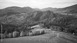 Beautiful mountain autumn landscape with meadow and colorful forest