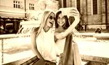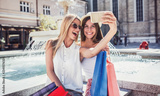 Selfie after shopping. Two young women with shopping bags take a rest in the city park. Consumerism, lifestyle concept