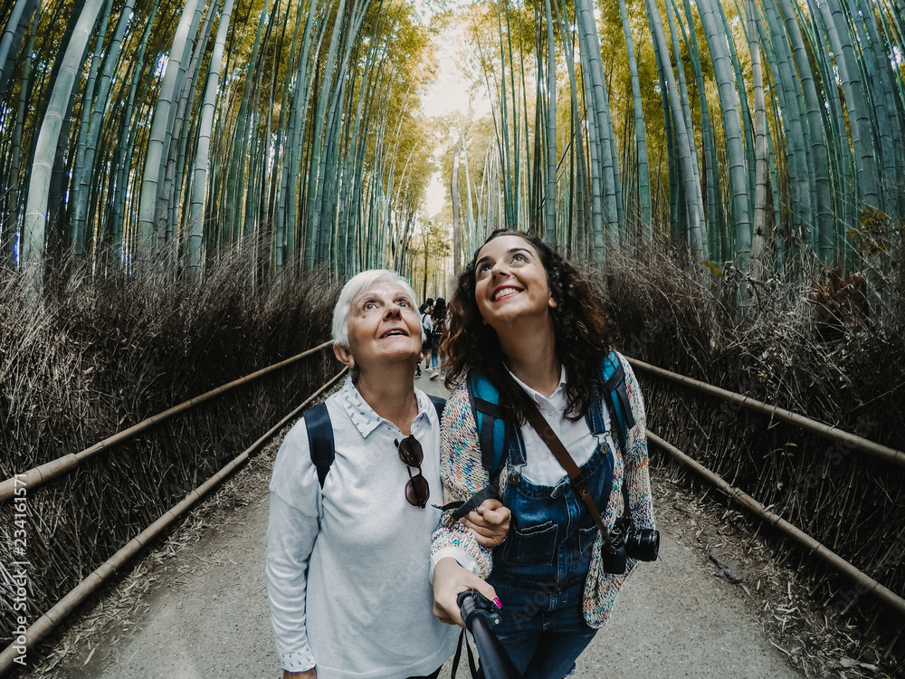 .Mother and daughter touring Japan and taking a picture together. Visiting the bamboo forest located in Arashiyama, Kyoto. Lifestyle. Travel photography.