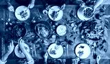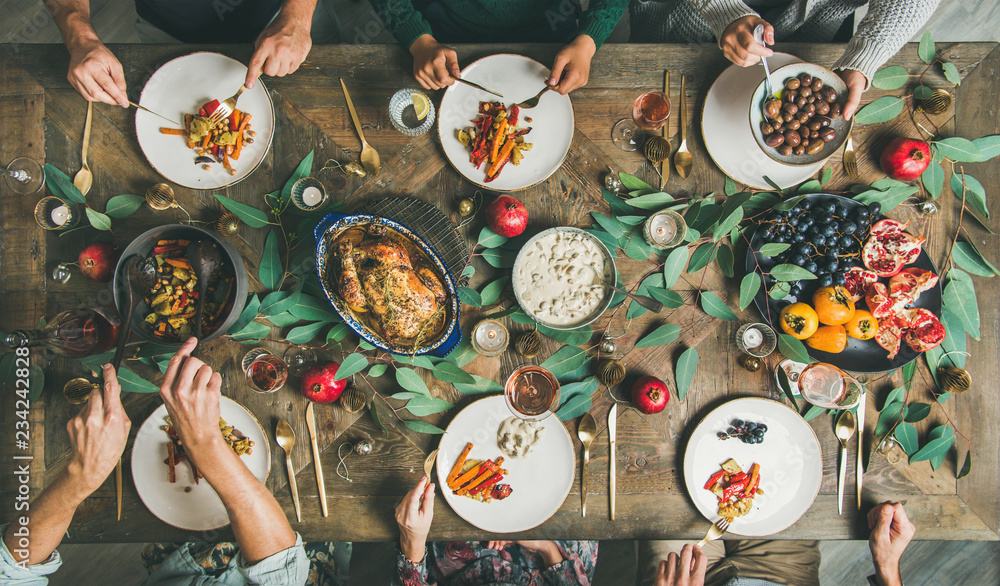 Traditional Christmas, New Year holiday celebration. Flat-lay of friends or family eating various food at festive table with turkey or chicken, vegetables, mushroom sauce, fruit, top view