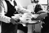Waiter holds the tray with soups