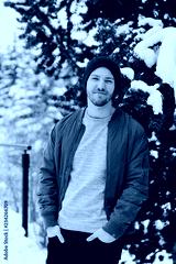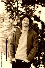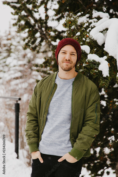Young Trendy Man in Green Bomber Jacket Enjoying the Winter Snow on a Small Bridge in Colorado