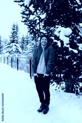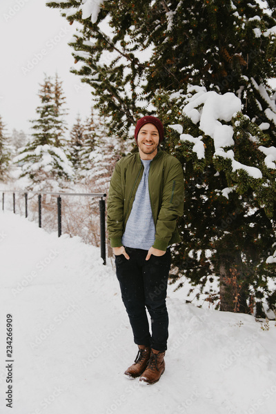 Young Trendy Man in Green Bomber Jacket Enjoying the Winter Snow on a Small Bridge in Colorado