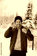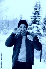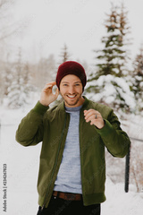Young Trendy Man in Green Bomber Jacket Enjoying the Winter Snow on a Small Bridge in Colorado