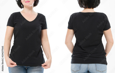 Women black blank t shirt, front and back rear view isolated on white background. Template shirt, copy space and mock up for print design. Cropped image