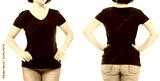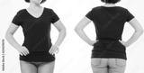 Women black blank t shirt, front and back rear view isolated on white background. Template shirt, copy space and mock up for print design. Cropped image