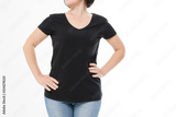 Women black blank t shirt, front view isolated on white background. Template shirt, copy space and mock up for print design. Cropped image