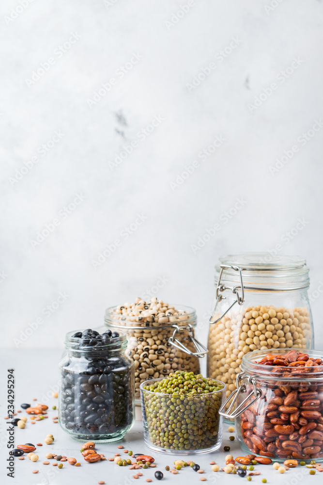 Assortment of vegan protein source food, legumes, lentils, chickpeas, beans
