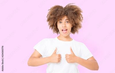 Young african american woman in template blank t shirt showing big thumb up isolated on pink background. Afro curly hair. Happy and success concept. Copy space