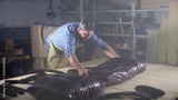 portrait professional man in an apron with a beard in the workshop is engaged in the installation of the chair