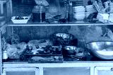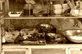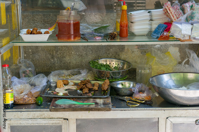 Outdoor kitchen in street food stall with bowls and cutlery to prepare food